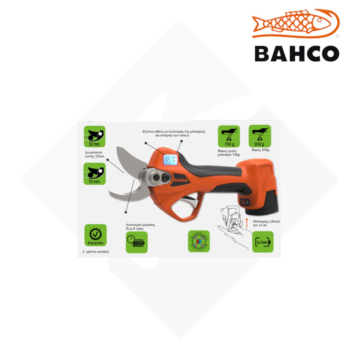 Ψαλίδι κλάδου μπαταρίας BCL20IB της εταιρείας BAHCO, ιδανικό για κλάδεμα σε δύσκολα σημεία, με μεγάλη ταχύτητα, είναι ακριβές ελαφρύ και ευέλικτο…